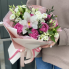 Нежный букетик с пионовидными розами, эустомой и орхидеей с добавлением эвкалипта в стильной упаковке